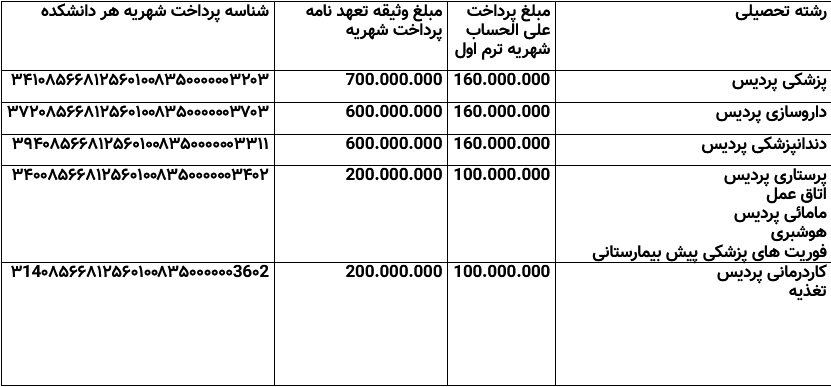 • مبلغ واریز شهریه به صورت علی الحساب  80.000. 000 (هشتاد میلیون ریال) برای رشته‌های دکتری عمومی و