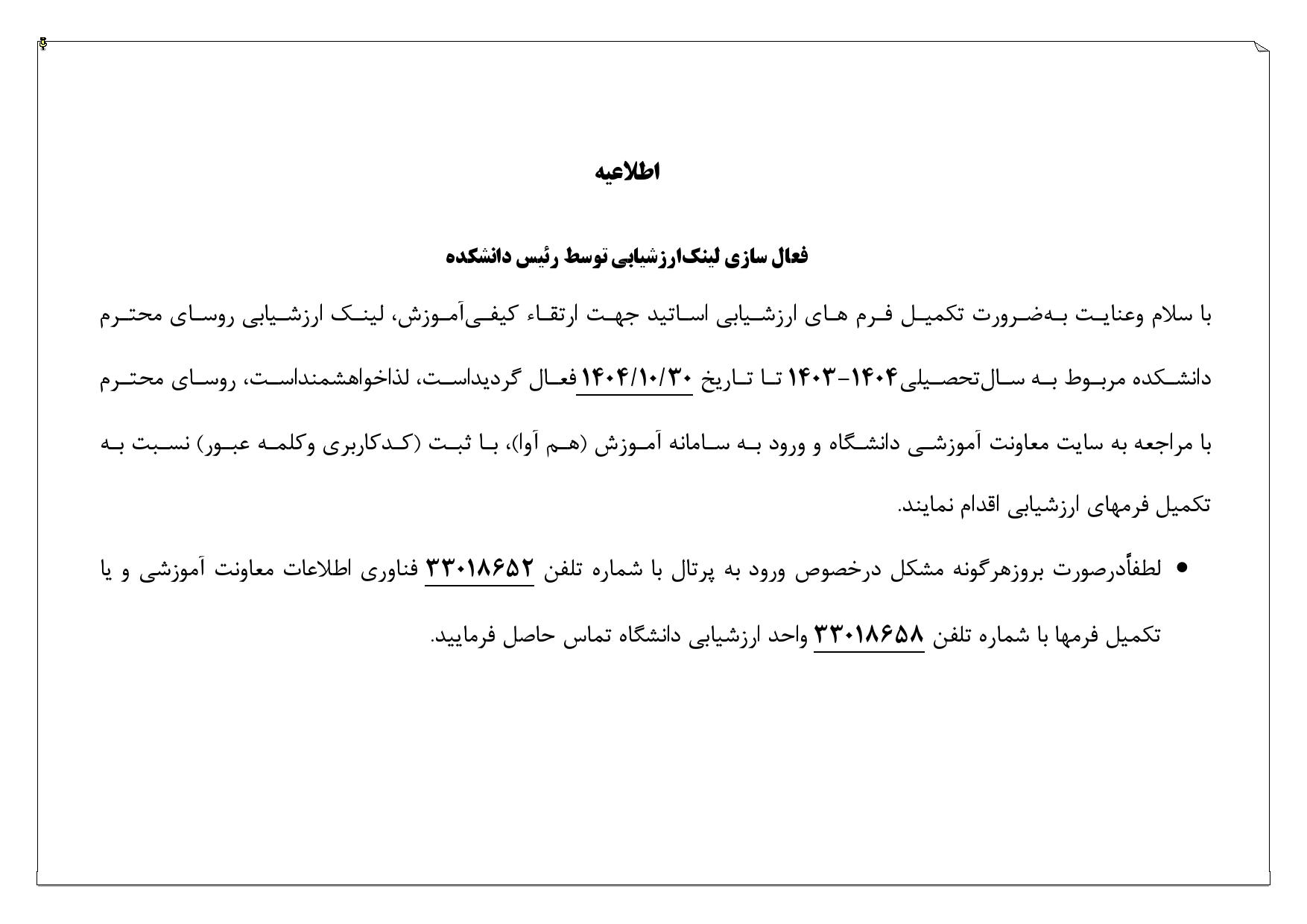 فعال سازی لینک ارزشیابی توسط رؤسای محترم دانشکده ها